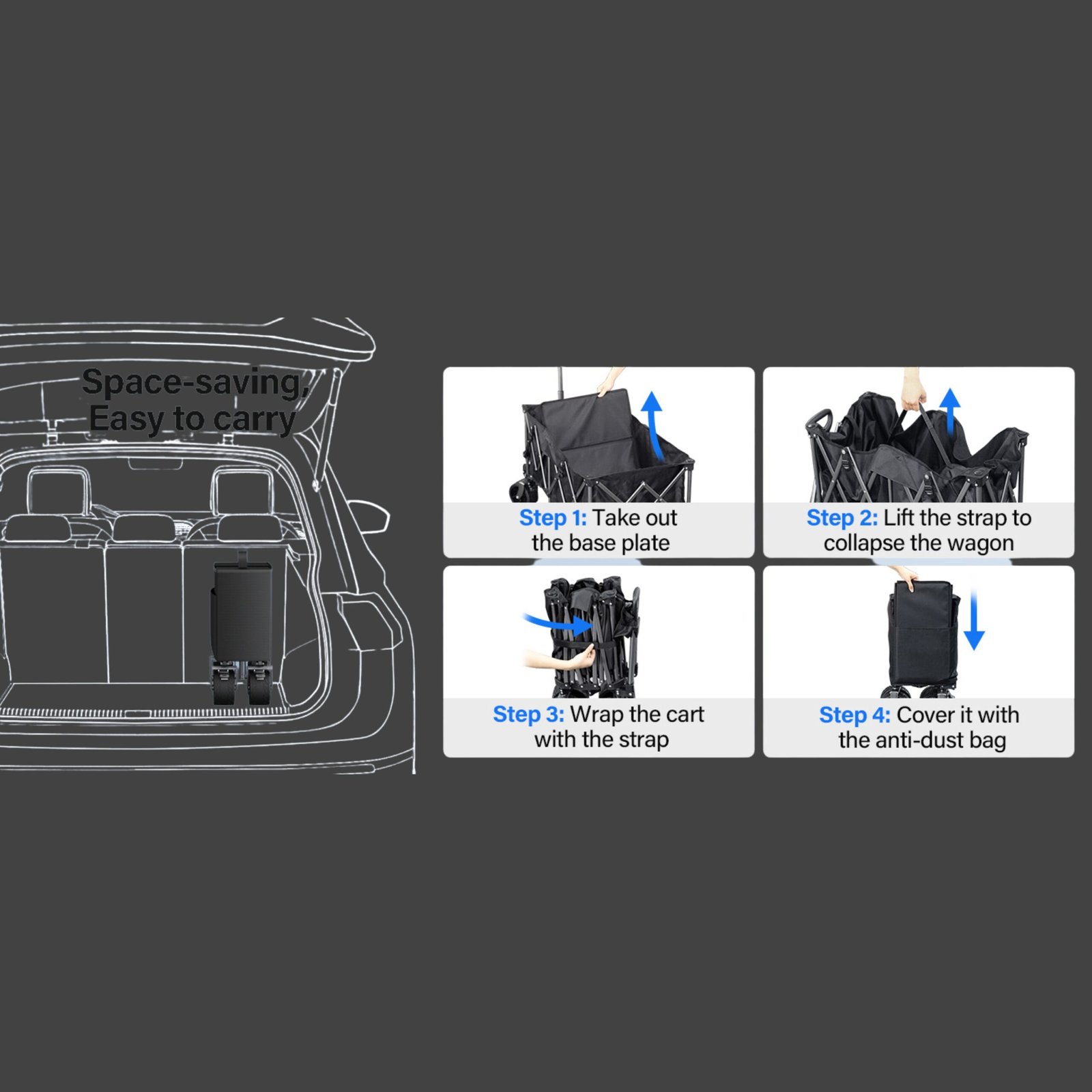 When not in use, the wagon folds down compactly, saving space in your car or storage area. Whether you’re heading to the beach, picnic, garden, or campsite, this utility wagon delivers unbeatable convenience and reliability.