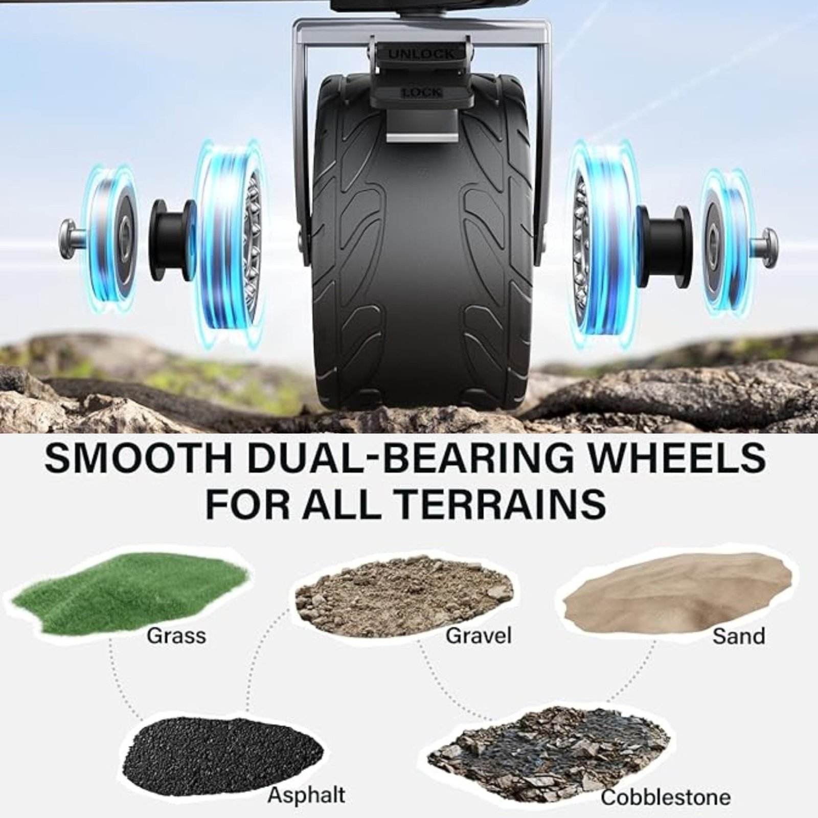 - All-Terrain Wheels: Thick, rugged wheels handle sand, grass, or gravel with ease.