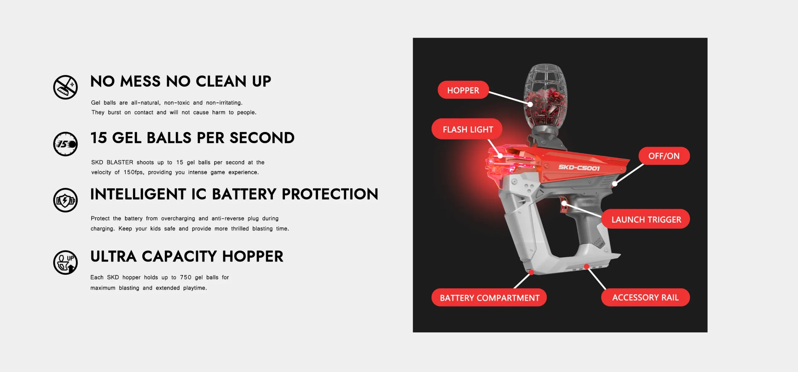 The SKD-CS001 is made from robust materials that withstand vigorous use, making it ideal for both indoor and outdoor environments. Its ergonomic design ensures that it fits comfortably in your hands, allowing for better control and less fatigue during prolonged gaming. Safety is a priority with this model, featuring a secure safety lock and using non-toxic, biodegradable gel pellets that are safe for players and the environment.
